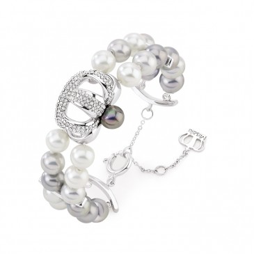 Il bracciale è realizzato in perle, dai toni champagne e bianco, ed è formato al centro da una corona tempestata di cristalli, la perla nera sulla sommità, richiama quella della collana.