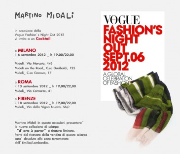 Anche quest’anno Martino Midali ha deciso di aderire alla VFNO 2012 con tre delle sue boutique di Milano (6 Settembre – Via Mercato 4/6, Corso Garibaldi 125, Corso Genova 17), una di Roma (13 Settembre – Via delle Carrozze 41) e quella di Firenze (18 Settembre – Via della Vigna Nuova 56/r).