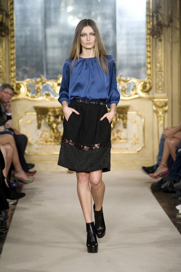 La creazione, dotata di un’anima sofisticata, è perfetta per le serate speciali, ma si adatta facilmente a chi ricerca un look magico anche nella quotidianità. La gonna è caratterizzata dal total black che viene declinato in diversi materiali e punti luce, creando un pezzo unico dal mood aristocratico. La skirt della maison Massimo Rebecchi è ralizzata in morbido broccato di seta in patch con bouclè, applicazioni hand made di pietre, piume e micro paillettes.