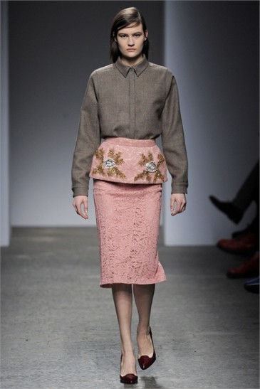 SEGNI PARTICOLARI: Dalla prima uscita si nota come il tema portante di questa collezione siano le sovrapposizioni ed il mix and match. Si osa mescolando insieme tartan, rilievi metallici e stampe floreali. Le maglie-accessorio con pietre e swarovski  impreziosiscono outfits con cardigan oversize e gonne in lana a tubo dal gusto leggermente castigato. Il bon ton di n°21 passa per l’estremo oriente con una carrellata di capi dalle linee rigide che riprendono forme e stampe dai classici kimono giapponesi.