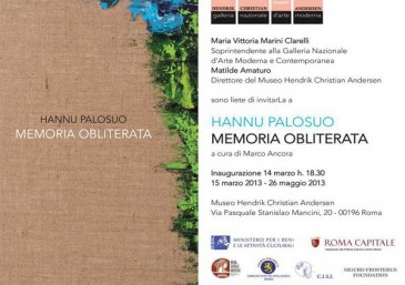 E’ stata prorogata al 9 giugno la mostra “Memoria obliterata” dell’artista Hannu Palosuo presso il museo Hendrik Christian Andersen di Roma. Inaugurata il 14 marzo scorso, doveva terminare il 26 maggio; ma, evidentemente il museo H.C. Andersen ha voluto tenere aperte le porte al pubblico ancora più a lungo, visto probabilmente il gran successo che le opere di Hannu Palosuo hanno riscontrato.