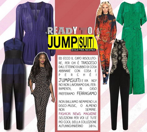 Jump (suit) e via…no? No, non lavoriamo dal ferramenta, in caso preferiamo Ferragamo. Non balliamo nemmeno la disco-music, o almeno non sempre. Fashion News Magazine seleziona per voi le tute più cool della collezione autunno/inverno 2014.
