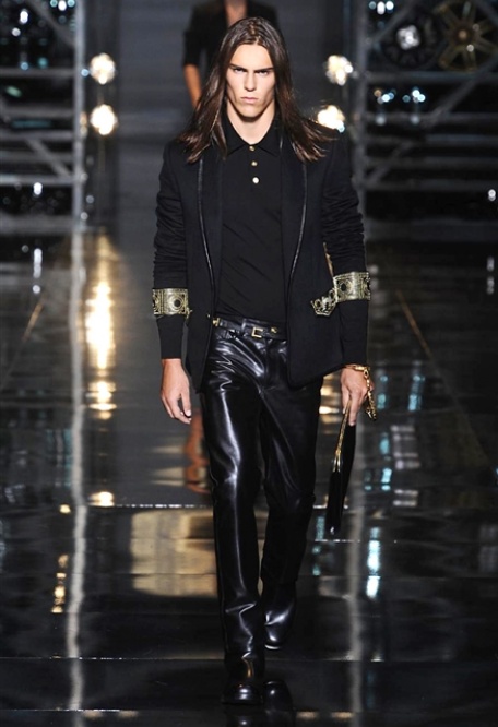 Segni Particolari: Donatella Versace presenta la sua visione della mascolinità’ stravagante per l’inverno 2014/2015. La collezione è un collage degli stampati iconici della mason accostati a denim strappati, sdruciti e spruzzati di colore ad effetto punk, alla pelle, graffiti streetart, borchie e ad elementi che ci riportano ai vecchi film western, con tanto di stella da Sceriffo. Collo alto e maniche a tre quarti, camicie sovrapposte ai pullover, giacconi portati aperti e tanta pelle in mostra che sia la vostra o quella degli immancabili rock pants in black; queste le nuove tendenze in casa Versace.