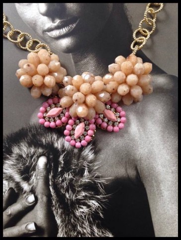 Tutti i colori purché siano vivi ed emozionanti…. Per quanto riguarda i materiali: pietre, resine, cristalli, metalli, catene, pezzi vintage.”