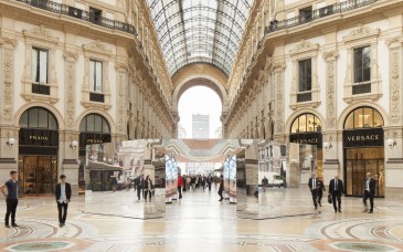 Per celebrare la fine dei lavori di restauro della Galleria Vittorio Emanuele II di Milano, realizzati grazie al contributo di Versace, Prada e LaFeltrinelli, un’installazione dislocata sulla sua superficie racconta immagini, video, storie e dati raccolti in 13 mesi di cantiere.