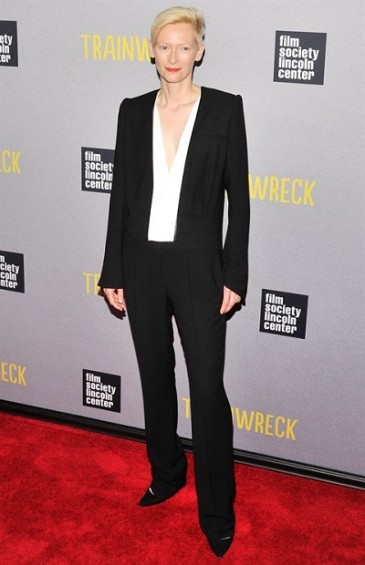 Lo stile efebico ed informale di Tilda Swinton non si discute né si apprezza ma si ammira in qualsiasi circostanza lo si voglia esibire. Anche in questa presentazione del suo ultimo film ‘Trainwreck’, tenutasi alla Alice Tully Hall di New York, il suo look ha stupito tutti pur nella sua lineare essenzialità e nel suo tocco androgino; il completo di Haider Ackermann, facente parte della collezione Autunno-Inverno 2015, si sviluppa con un jumpsuit nero e bianco, segnato dalla verticalità dello scollo su cui si posa il blazer nero, morbido sul pantalone lineare.