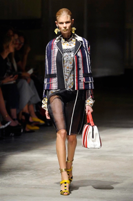 Segni particolari: Anticonformismo, eccentricità e capovolgimento della tradizione sono ancora una volta i cardini dello stile Prada, che osa presentando una collezione all’avanguardia. Ciò è visibile nelle sovrapposizioni di principe di Galles e pied de poule, negli inserti fluo, nelle righe verticali larghe a contrasto, ma soprattutto in una vera e propria rivoluzione del tailleur che assume le caratteristiche di un prodotto del design industriale. In una ri-esplorazione del passato, ma sempre con uno sguardo all’estetica del futuro, il tailleur classico si arricchisce di una retina in plastica che sostituisce la sciarpa. I tessuti usati sono organza, tweed, pelle, camoscio, astrakan, vernice e coccodrillo, alcuni dei quali sovrapposti tra di loro. Pailettes, finti smeraldi, fiori 3D, ricami e trasparenze arricchiscono gonne al ginocchio, bluse, giacche in pelle, trench e giacche strutturate.