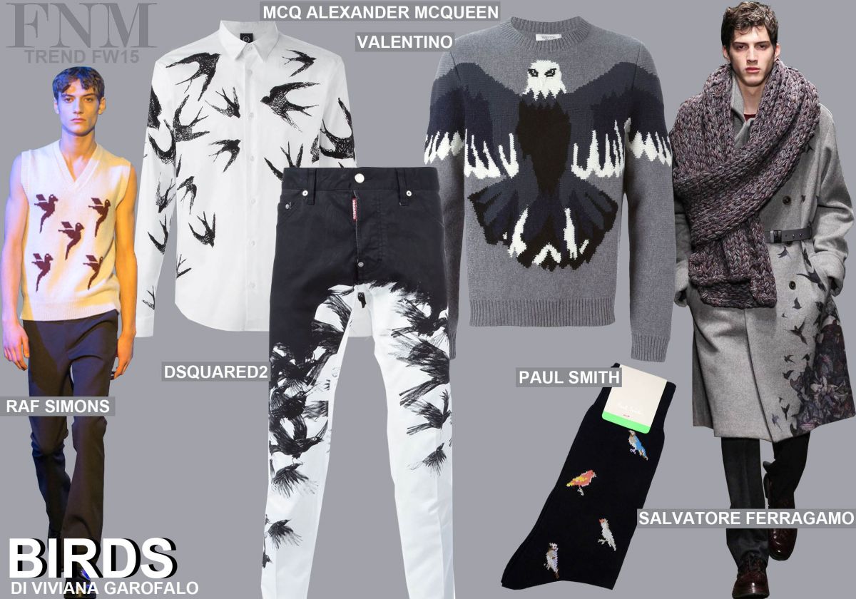 Sul cappotto di Salvatore Ferragamo così come su pantaloni e camicia di Dsquared2 e MCQ Alexander McQueen troviamo micro e macro stampe di stormi di uccelli. Più ordinati e simmetrici sono invece gli uccelli realizzati a maglia sul gilet di Raf Simons e sui calzini di Paul Smith. Valentino invece opta per il piazzamento di un’aquila multicolore che con le sue ali è in grado di coprire anche le maniche del pullover.