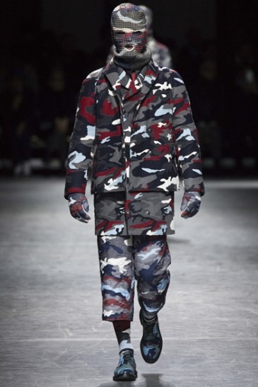 Tutti i look che sfilano ripropongono la medesima stampa mimetica, dai lunghi cappotti, alle pellicce, alle giacche, ai pantaloni corti al polpaccio, senza escludere sneakers, passamontagna e calzettoni.