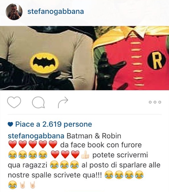 “Cosa stanno facendo i nostri cari stilisti per i diritti che noi tutti stiamo aspettando? Come si espongono? Apparte mettere in commercio delle borsette con coppie di uomini o donne coi loro figli? Non parlo solo di Batman & Robin ma di tutto il mondo della moda. Basterebbe ogni tanto pubblicare un link, un video, una frase nei loro social media per raggiungere milioni di persone, riportando informazioni corrette o un minimo di supporto”. Questo il post scatenante le polemiche sui social, da Facebook ad Instagram, dove Stefano Gabbana ha postato un ironico scatto di Batman & Robin chiedendo a tutti, compreso il Burlon, di esprimere la propria opinione in merito alla suddetta frecciatina che si focalizza sulla poca azione concreta volta alla difesa dei diritti umani, omosessuali e non.