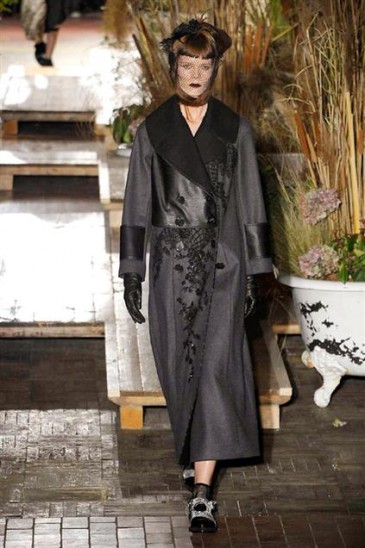 Segni particolari: “Dalle giacche da uomo, severe, quelle di sartoria, sono pian piano passata a giacche senza struttura, che scivolano addosso. Amo sempre i cappotti militari lunghi con grandi revers, le cappe, le mantelle ma ho scoperto come imbellirli con decori e ricami. Ho bisogno di leggerezza, oggi, e quindi i miei abiti asciutti oggi hanno stampe fiorate e rouches e bottoncini rivestiti e plastron ricamati. E poi non ho più voglia di formalità e convenzioni e quindi indosso capi che non ti aspetteresti mai. Sono diventata audace. Ricami, incastri di tessuti e volant, punto smock, bordi merlettati e pannelli plissé e lunghi e asimmetrici. Mischio, mischio tutto. Ho conservato la passione che avevo, ricordi? Per gli abiti con le stampe a fiori, evidenti o sfocati non importa, a bouquet di campo e rovi e cardi, rose canine e mi sono divertita a tracciare volti con la china sulla seta. Sono pur sempre una folle ragazza innamorata!”.
