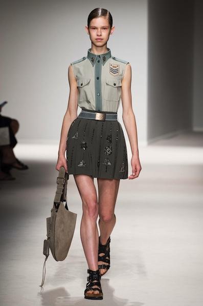 Accessori: Shopping bag dal fascino artigianale in vitello diventano sacche militari, nuove hobo si sposano con moderne cartuccere. Ai piedi sandali gladiatore alla caviglia e fin sul ginocchio.