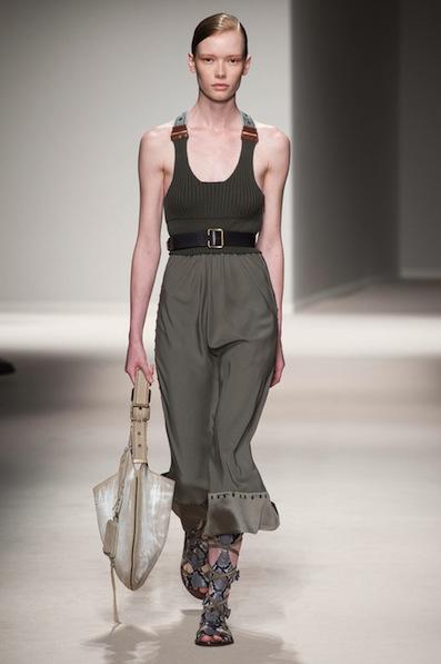 Accessori: Shopping bag dal fascino artigianale in vitello diventano sacche militari, nuove hobo si sposano con moderne cartuccere. Ai piedi sandali gladiatore alla caviglia e fin sul ginocchio.