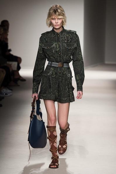 Accessori: Shopping bag dal fascino artigianale in vitello diventano sacche militari, nuove hobo si sposano con moderne cartuccere. Ai piedi sandali gladiatore alla caviglia e fin sul ginocchio.