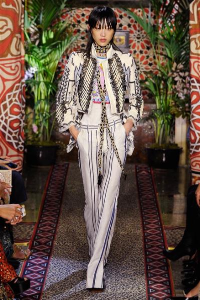 Segni Particolari: Un’accecante atmosfera multicolore nella collezione Roberto Cavalli Primavera-Estate 2017, uno sfavillio di tinte tra loro contrastanti in un’innegabile ritorno al lontano mondo delle Americhe, richiamanti le tribù Navajo e Apache: appaiono simile a squaw sfolgoranti abiti dai mille colori, fluttuanti, ricchissimi di cromie, frange, sciarpine che danzano tra loro in un trionfo di gonne, abiti, pantaloni che si alternano con kimono, tessuti egiziani, buffalo soldiers e stampe giaguaro, una vera e propria ode al mitico Elvis con la classica vena rock and roll dello stile Cavalli.