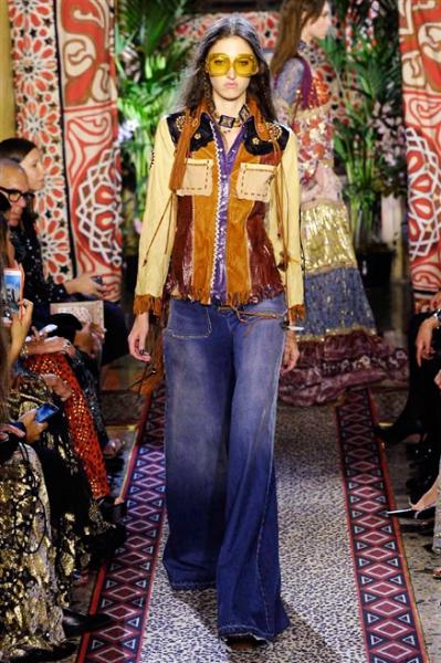 Segni Particolari: Un’accecante atmosfera multicolore nella collezione Roberto Cavalli Primavera-Estate 2017, uno sfavillio di tinte tra loro contrastanti in un’innegabile ritorno al lontano mondo delle Americhe, richiamanti le tribù Navajo e Apache: appaiono simile a squaw sfolgoranti abiti dai mille colori, fluttuanti, ricchissimi di cromie, frange, sciarpine che danzano tra loro in un trionfo di gonne, abiti, pantaloni che si alternano con kimono, tessuti egiziani, buffalo soldiers e stampe giaguaro, una vera e propria ode al mitico Elvis con la classica vena rock and roll dello stile Cavalli.