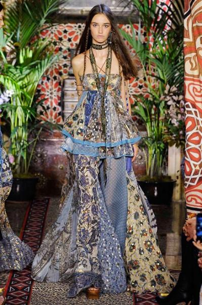 Segni Particolari: Un’accecante atmosfera multicolore nella collezione Roberto Cavalli Primavera-Estate 2017, uno sfavillio di tinte tra loro contrastanti in un’innegabile ritorno al lontano mondo delle Americhe, richiamanti le tribù Navajo e Apache: appaiono simile a squaw sfolgoranti abiti dai mille colori, fluttuanti, ricchissimi di cromie, frange, sciarpine che danzano tra loro in un trionfo di gonne, abiti, pantaloni che si alternano con kimono, tessuti egiziani, buffalo soldiers e stampe giaguaro, una vera e propria ode al mitico Elvis con la classica vena rock and roll dello stile Cavalli.