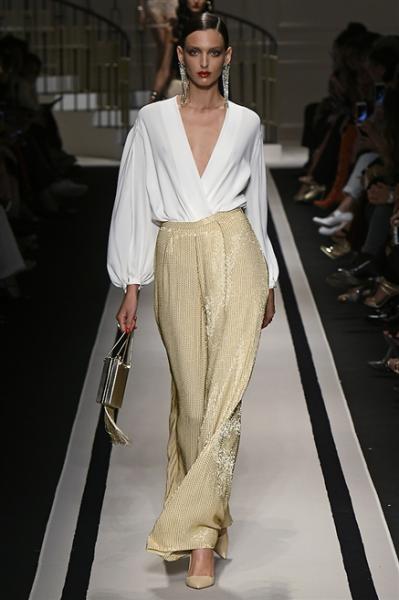 Segni particolari: La donna che veste Elisabetta Franchi è sensuale, provocante ed elegante. Ama osare come una vera diva. E lo fa con disinvoltura e naturalezza. I mitici anni ’80 riecheggiano nell’intera collezione S/S 2017, ispirata alle opere trasgressiva e raffinate di Helmut Newton. Eccessiva nei dettagli e nelle forme, la linea propone abiti sfarzosi per un look che esalta appieno la femminilità. Spacchi vertiginosi e scollature profonde celebrano la silhouette, long dress ricamati con trasparenze oculate regalano un effetto nudo sempre raffinato. Maniche e spalle sono messe in evidenza da rouches e balze, il décolleté da giochi asimmetrici. Gonne a sirena, body e micro top fasciano il corpo esaltandone le forme. I pantaloni a vita alta, a zampa e a palazzo mostrano le gambe grazie a spacchi profondi o trasparenze. Giacche oversize e cardigan sono rivisitati: arricchiti da paillettes e dettagli laminati. Le frange donano movimento ai capi e agli accessori. Rete e denim strappato mostrano un carattere squisitamente pop-rock. Non mancano le stampe animalier, must del marchio.