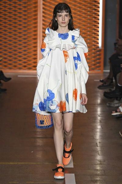 Segni Particolari: In occasione della Milano Fashion Week, Massimo Giorgetti presenta la collezione SS 2017, firmata MSGM, ispirata allo stile college. Una collezione interessante che richiama contaminazioni con elementi mutuati allo sportswear. La classica gonna viene cosparsa da ruches, la camicia maschile presenta maniche allungate ed è attraversata da un maxi jabot. Le maglie sono abbinate a pantaloni ampi tulle, crochet, nylon, cotone, maglia, pizzo. Camicie e gonne ampie sono cosparse da ruches all over.