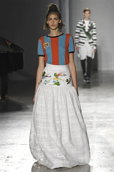Segni Particolari: Ispirata al tema del calcio, come sport internazionale, che unisce popoli diversi per etnia, cultura e religione, la nuova collezione primavera estate 2017, firmata Stella Jean, è pensata per una donna forte, determinata e gentile. Una moda letteralmente “senza confini”, che trova la sua ispirazione nel caos ordinato dei mercati e delle case da tè di Yangon, dove le sovrapposizioni di “longyi”, vesti tipiche birmane, fonte di ispirazione per look sperimentali dall’esprit borghese. Dall’atmosfera dei ricevimenti diplomatici nel Sud-est asiatico degli anni ’40, fino ad arrivare ad Aung San Suu Kyi (premio Nobel per la pace), simbolo della resistenza pacifica e della promozione delle proprie radici. Nella collezione, Sarong che si sovrappongono agli chemisier dai volumi fluidi diventano perfette divise geek chic, distillati di un cross over culturale. Maglie intarsiate con la fascia da capitano e polo vintage-soccer sono abbinate a gonne iper femminili. Il decorativismo di Préfète Duffaut, pittore della scuola di Saint Soleil, irrompe sulle plissettature metropolitane.