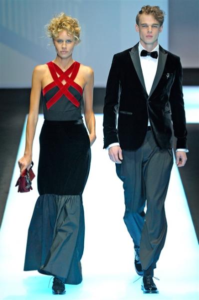 Di grande importanza, come è consuetudine nelle collezioni Armani, la cura per i dettagli e i tagli degli abiti sportivi come pure le innovative giacche in velluto o jacquard che alleggeriscono e rendono dinamiche le tenute formali.