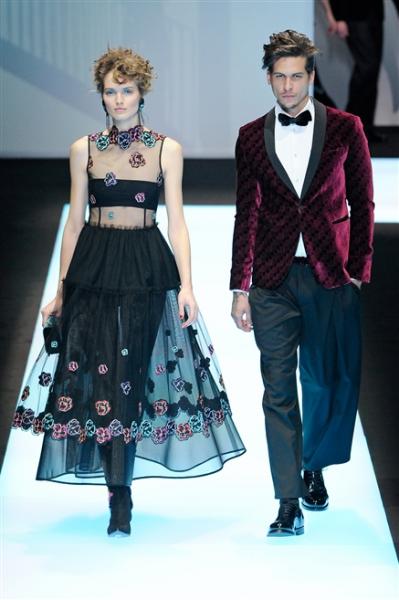 Di grande importanza, come è consuetudine nelle collezioni Armani, la cura per i dettagli e i tagli degli abiti sportivi come pure le innovative giacche in velluto o jacquard che alleggeriscono e rendono dinamiche le tenute formali.