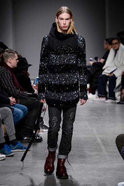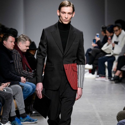 Segni Particolari: Trionfo di righe. Ports 1961 fa sfilare sulle passerelle della Milano Fashion Week completi e camice dal dettaglio stripes declinandolo sia nella versione full print che solo accennata. Una collezione che strizza l’occhio allo stile urban metropolitano con inevitabili incursioni nel mondo giapponese riportato a più riprese nei volumi e nei simboli sulle maxi felpe. Un uomo vestitto da sovrapposizioni e cromie contrastanti, si va dal classico bianco e nero fino al giallo e nero o rosso e bianco. I volumi sono estremamente ampi sia negli outwear che nel taglio dei pantaloni, non mancano comunque le proposte slim fit. Decisamente interessante la ricerca che guarda al mondo dell’estrema protezione con giubbotti anti proiettile.