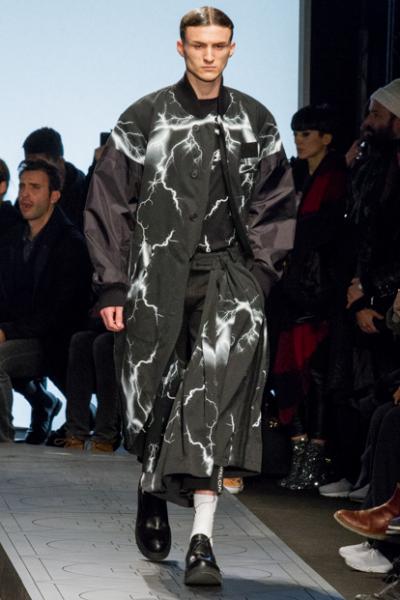 Segni particolari: Mentre un’orchestra di violini suona delicatamente, i modelli sfilano sicuri in passerella: il ritmo si fa incalzante e gli abiti sono sempre più elaborati e ricchi di dettagli. L’intera linea ruota attorno al concetto di “Rinascita”: lo stilista gioca con asimmetrie e tessuti a contrasto. Maglie con stampe, giubbini in pelle e marchio in evidenza. Evidente l’ispirazione militare su impermeabili, t-shirt e pantaloni sostenuti da imbracature in nylon.  È uno streetwear colorato e mai banale.