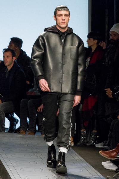 Segni particolari: Mentre un’orchestra di violini suona delicatamente, i modelli sfilano sicuri in passerella: il ritmo si fa incalzante e gli abiti sono sempre più elaborati e ricchi di dettagli. L’intera linea ruota attorno al concetto di “Rinascita”: lo stilista gioca con asimmetrie e tessuti a contrasto. Maglie con stampe, giubbini in pelle e marchio in evidenza. Evidente l’ispirazione militare su impermeabili, t-shirt e pantaloni sostenuti da imbracature in nylon.  È uno streetwear colorato e mai banale.