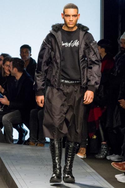 Segni particolari: Mentre un’orchestra di violini suona delicatamente, i modelli sfilano sicuri in passerella: il ritmo si fa incalzante e gli abiti sono sempre più elaborati e ricchi di dettagli. L’intera linea ruota attorno al concetto di “Rinascita”: lo stilista gioca con asimmetrie e tessuti a contrasto. Maglie con stampe, giubbini in pelle e marchio in evidenza. Evidente l’ispirazione militare su impermeabili, t-shirt e pantaloni sostenuti da imbracature in nylon.  È uno streetwear colorato e mai banale.
