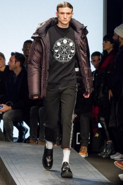 Segni particolari: Mentre un’orchestra di violini suona delicatamente, i modelli sfilano sicuri in passerella: il ritmo si fa incalzante e gli abiti sono sempre più elaborati e ricchi di dettagli. L’intera linea ruota attorno al concetto di “Rinascita”: lo stilista gioca con asimmetrie e tessuti a contrasto. Maglie con stampe, giubbini in pelle e marchio in evidenza. Evidente l’ispirazione militare su impermeabili, t-shirt e pantaloni sostenuti da imbracature in nylon.  È uno streetwear colorato e mai banale.