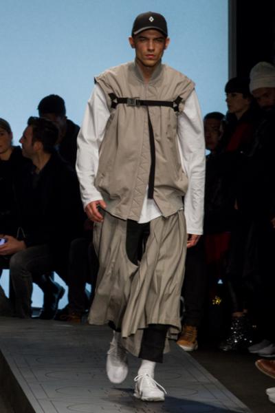 Segni particolari: Mentre un’orchestra di violini suona delicatamente, i modelli sfilano sicuri in passerella: il ritmo si fa incalzante e gli abiti sono sempre più elaborati e ricchi di dettagli. L’intera linea ruota attorno al concetto di “Rinascita”: lo stilista gioca con asimmetrie e tessuti a contrasto. Maglie con stampe, giubbini in pelle e marchio in evidenza. Evidente l’ispirazione militare su impermeabili, t-shirt e pantaloni sostenuti da imbracature in nylon.  È uno streetwear colorato e mai banale.