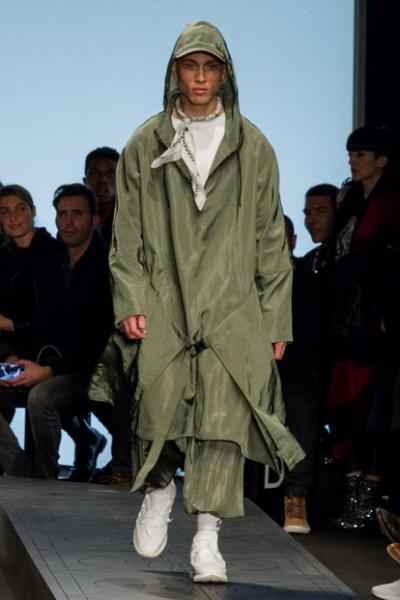 Segni particolari: Mentre un’orchestra di violini suona delicatamente, i modelli sfilano sicuri in passerella: il ritmo si fa incalzante e gli abiti sono sempre più elaborati e ricchi di dettagli. L’intera linea ruota attorno al concetto di “Rinascita”: lo stilista gioca con asimmetrie e tessuti a contrasto. Maglie con stampe, giubbini in pelle e marchio in evidenza. Evidente l’ispirazione militare su impermeabili, t-shirt e pantaloni sostenuti da imbracature in nylon.  È uno streetwear colorato e mai banale.
