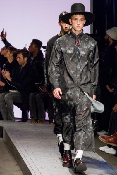 Segni particolari: Mentre un’orchestra di violini suona delicatamente, i modelli sfilano sicuri in passerella: il ritmo si fa incalzante e gli abiti sono sempre più elaborati e ricchi di dettagli. L’intera linea ruota attorno al concetto di “Rinascita”: lo stilista gioca con asimmetrie e tessuti a contrasto. Maglie con stampe, giubbini in pelle e marchio in evidenza. Evidente l’ispirazione militare su impermeabili, t-shirt e pantaloni sostenuti da imbracature in nylon.  È uno streetwear colorato e mai banale.