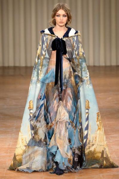 Una collezione che richiama Venezia e i ritratti di Giovanni Boldini, che ritroviamo nelle stampe e nei ricami dorati. Abiti e cappe con la stampa di piazza san Marco e i canali, giacche e cappotti doppio petto con grandi bottoni d’oro e ricami, tessuti stampati a righe, colli alla marinara ma anche tocchi di gran femminilità tra piume e ruches. Eleganti abiti rosa e giallo senape e fluttuanti vestiti da sera neri, rossi e viola. Per la prima volta in passerella anche il velo islamico, l’hijab, indossato dalla modella somalo americana Halima Aden. A fine show non può mancare il richiamo alla prima Capsule Collection firmata Alberta Ferretti, la Rainbow Week Capsule Collection, sette maglioni in cashmere di sette tonalità diverse, una per ogni giorno della settimana, con tanto di scritta, dal “Monday” al “Sunday”
