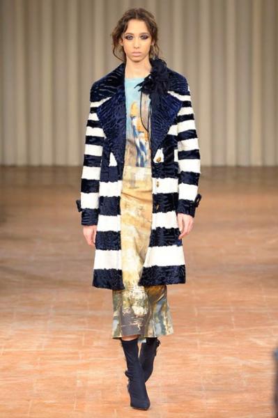 Una collezione che richiama Venezia e i ritratti di Giovanni Boldini, che ritroviamo nelle stampe e nei ricami dorati. Abiti e cappe con la stampa di piazza san Marco e i canali, giacche e cappotti doppio petto con grandi bottoni d’oro e ricami, tessuti stampati a righe, colli alla marinara ma anche tocchi di gran femminilità tra piume e ruches. Eleganti abiti rosa e giallo senape e fluttuanti vestiti da sera neri, rossi e viola. Per la prima volta in passerella anche il velo islamico, l’hijab, indossato dalla modella somalo americana Halima Aden. A fine show non può mancare il richiamo alla prima Capsule Collection firmata Alberta Ferretti, la Rainbow Week Capsule Collection, sette maglioni in cashmere di sette tonalità diverse, una per ogni giorno della settimana, con tanto di scritta, dal “Monday” al “Sunday”