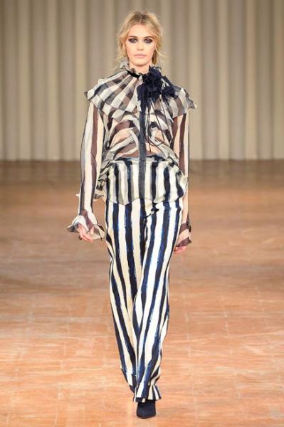 Una collezione che richiama Venezia e i ritratti di Giovanni Boldini, che ritroviamo nelle stampe e nei ricami dorati. Abiti e cappe con la stampa di piazza san Marco e i canali, giacche e cappotti doppio petto con grandi bottoni d’oro e ricami, tessuti stampati a righe, colli alla marinara ma anche tocchi di gran femminilità tra piume e ruches. Eleganti abiti rosa e giallo senape e fluttuanti vestiti da sera neri, rossi e viola. Per la prima volta in passerella anche il velo islamico, l’hijab, indossato dalla modella somalo americana Halima Aden. A fine show non può mancare il richiamo alla prima Capsule Collection firmata Alberta Ferretti, la Rainbow Week Capsule Collection, sette maglioni in cashmere di sette tonalità diverse, una per ogni giorno della settimana, con tanto di scritta, dal “Monday” al “Sunday”