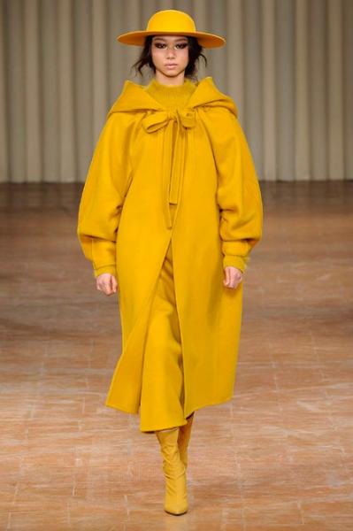 Una collezione che richiama Venezia e i ritratti di Giovanni Boldini, che ritroviamo nelle stampe e nei ricami dorati. Abiti e cappe con la stampa di piazza san Marco e i canali, giacche e cappotti doppio petto con grandi bottoni d’oro e ricami, tessuti stampati a righe, colli alla marinara ma anche tocchi di gran femminilità tra piume e ruches. Eleganti abiti rosa e giallo senape e fluttuanti vestiti da sera neri, rossi e viola. Per la prima volta in passerella anche il velo islamico, l’hijab, indossato dalla modella somalo americana Halima Aden. A fine show non può mancare il richiamo alla prima Capsule Collection firmata Alberta Ferretti, la Rainbow Week Capsule Collection, sette maglioni in cashmere di sette tonalità diverse, una per ogni giorno della settimana, con tanto di scritta, dal “Monday” al “Sunday”