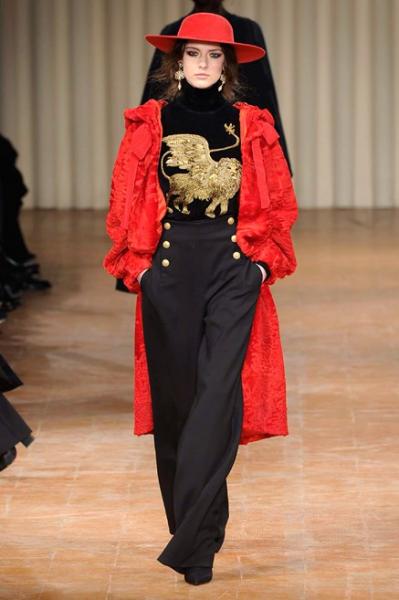 Una collezione che richiama Venezia e i ritratti di Giovanni Boldini, che ritroviamo nelle stampe e nei ricami dorati. Abiti e cappe con la stampa di piazza san Marco e i canali, giacche e cappotti doppio petto con grandi bottoni d’oro e ricami, tessuti stampati a righe, colli alla marinara ma anche tocchi di gran femminilità tra piume e ruches. Eleganti abiti rosa e giallo senape e fluttuanti vestiti da sera neri, rossi e viola. Per la prima volta in passerella anche il velo islamico, l’hijab, indossato dalla modella somalo americana Halima Aden. A fine show non può mancare il richiamo alla prima Capsule Collection firmata Alberta Ferretti, la Rainbow Week Capsule Collection, sette maglioni in cashmere di sette tonalità diverse, una per ogni giorno della settimana, con tanto di scritta, dal “Monday” al “Sunday”