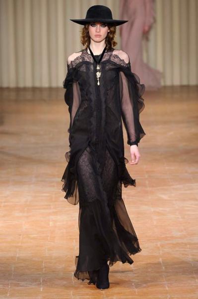 Una collezione che richiama Venezia e i ritratti di Giovanni Boldini, che ritroviamo nelle stampe e nei ricami dorati. Abiti e cappe con la stampa di piazza san Marco e i canali, giacche e cappotti doppio petto con grandi bottoni d’oro e ricami, tessuti stampati a righe, colli alla marinara ma anche tocchi di gran femminilità tra piume e ruches. Eleganti abiti rosa e giallo senape e fluttuanti vestiti da sera neri, rossi e viola. Per la prima volta in passerella anche il velo islamico, l’hijab, indossato dalla modella somalo americana Halima Aden. A fine show non può mancare il richiamo alla prima Capsule Collection firmata Alberta Ferretti, la Rainbow Week Capsule Collection, sette maglioni in cashmere di sette tonalità diverse, una per ogni giorno della settimana, con tanto di scritta, dal “Monday” al “Sunday”
