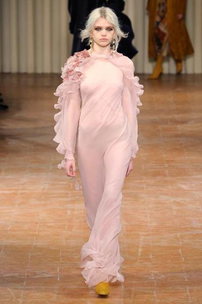 Una collezione che richiama Venezia e i ritratti di Giovanni Boldini, che ritroviamo nelle stampe e nei ricami dorati. Abiti e cappe con la stampa di piazza san Marco e i canali, giacche e cappotti doppio petto con grandi bottoni d’oro e ricami, tessuti stampati a righe, colli alla marinara ma anche tocchi di gran femminilità tra piume e ruches. Eleganti abiti rosa e giallo senape e fluttuanti vestiti da sera neri, rossi e viola. Per la prima volta in passerella anche il velo islamico, l’hijab, indossato dalla modella somalo americana Halima Aden. A fine show non può mancare il richiamo alla prima Capsule Collection firmata Alberta Ferretti, la Rainbow Week Capsule Collection, sette maglioni in cashmere di sette tonalità diverse, una per ogni giorno della settimana, con tanto di scritta, dal “Monday” al “Sunday”