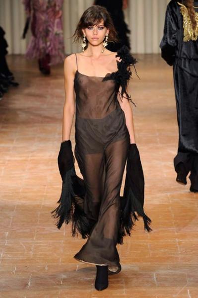 Una collezione che richiama Venezia e i ritratti di Giovanni Boldini, che ritroviamo nelle stampe e nei ricami dorati. Abiti e cappe con la stampa di piazza san Marco e i canali, giacche e cappotti doppio petto con grandi bottoni d’oro e ricami, tessuti stampati a righe, colli alla marinara ma anche tocchi di gran femminilità tra piume e ruches. Eleganti abiti rosa e giallo senape e fluttuanti vestiti da sera neri, rossi e viola. Per la prima volta in passerella anche il velo islamico, l’hijab, indossato dalla modella somalo americana Halima Aden. A fine show non può mancare il richiamo alla prima Capsule Collection firmata Alberta Ferretti, la Rainbow Week Capsule Collection, sette maglioni in cashmere di sette tonalità diverse, una per ogni giorno della settimana, con tanto di scritta, dal “Monday” al “Sunday”