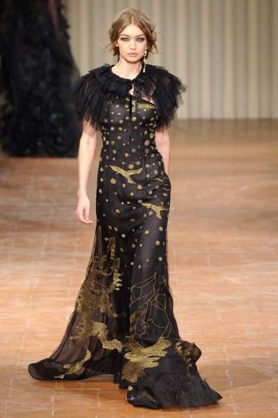 Una collezione che richiama Venezia e i ritratti di Giovanni Boldini, che ritroviamo nelle stampe e nei ricami dorati. Abiti e cappe con la stampa di piazza san Marco e i canali, giacche e cappotti doppio petto con grandi bottoni d’oro e ricami, tessuti stampati a righe, colli alla marinara ma anche tocchi di gran femminilità tra piume e ruches. Eleganti abiti rosa e giallo senape e fluttuanti vestiti da sera neri, rossi e viola. Per la prima volta in passerella anche il velo islamico, l’hijab, indossato dalla modella somalo americana Halima Aden. A fine show non può mancare il richiamo alla prima Capsule Collection firmata Alberta Ferretti, la Rainbow Week Capsule Collection, sette maglioni in cashmere di sette tonalità diverse, una per ogni giorno della settimana, con tanto di scritta, dal “Monday” al “Sunday”