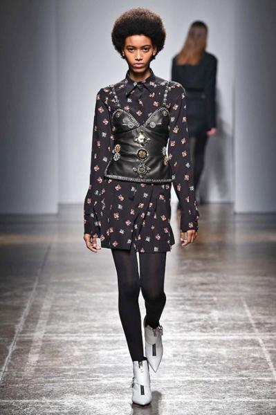 Segni Particolari: La figura femminile viene valorizzata con tocchi bondage e punk. Il classico montgomery vene reinterpretato nella versione varsity, i bustier in pelle si indossano sopra gli abiti a fiori. I tailleur, dal taglio maschile, si fanno preziosi grazie all’applicazione di cristalli e le giacche tartan si portano con i pantaloni da motociclista. Le minigonne si indossano con giacche brevi, i pantaloni sono slim e si abbinano a perfecto con broche e cristalli. In questa collezione, lana, maglia, pelle, cristalli, serpente, seta e cotone, convivono in armonia.