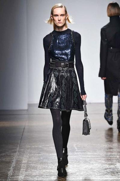 Segni Particolari: La figura femminile viene valorizzata con tocchi bondage e punk. Il classico montgomery vene reinterpretato nella versione varsity, i bustier in pelle si indossano sopra gli abiti a fiori. I tailleur, dal taglio maschile, si fanno preziosi grazie all’applicazione di cristalli e le giacche tartan si portano con i pantaloni da motociclista. Le minigonne si indossano con giacche brevi, i pantaloni sono slim e si abbinano a perfecto con broche e cristalli. In questa collezione, lana, maglia, pelle, cristalli, serpente, seta e cotone, convivono in armonia.