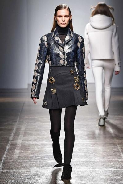 Segni Particolari: La figura femminile viene valorizzata con tocchi bondage e punk. Il classico montgomery vene reinterpretato nella versione varsity, i bustier in pelle si indossano sopra gli abiti a fiori. I tailleur, dal taglio maschile, si fanno preziosi grazie all’applicazione di cristalli e le giacche tartan si portano con i pantaloni da motociclista. Le minigonne si indossano con giacche brevi, i pantaloni sono slim e si abbinano a perfecto con broche e cristalli. In questa collezione, lana, maglia, pelle, cristalli, serpente, seta e cotone, convivono in armonia.