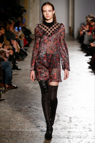 Segni Particolari: Francesco Scognamiglio ci propone una collezione all’insegna della femminilità in senso stretto che mette in evidenza la silhouette esaltandone il fascino, non cadendo mai nel banale e nel troppo “visto”. In primo piano una giacca peplum con cintura in pelle e un bottone in metallo a forma di sole su una gonna traforata a piccole borchie accompagnata da un pantalone a sigaretta; seguono gli abiti con micro stampe con inserti in velo a grandi pois; importanti i dress coat e i trench con colletti ad effetto pittura; da sogno i deliziosi long dress da sera, in tessuto nude ed inserti silver; sorprendenti i lingerie dress con effetti di trasparenza sui quali troviamo i polka dots di varie dimensioni. Da non farsi sfuggire i tailleur rosa e i vestiti neri con inserti greenery.