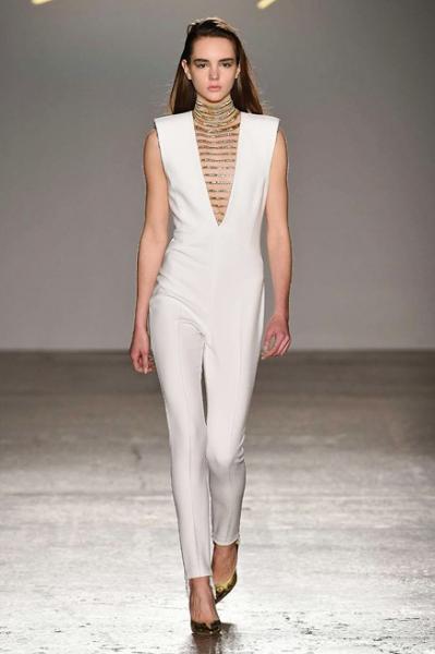 Segni Particolari: Il focus della collezione, è sulle spalle i cui volumi si accentuano, mentre le vite di giacche e cappotti si assottigliano. La silhuette è allungata, con i pantaloni dal taglio asciutto che si stringono alle caviglie con ghette. Eleganti e sofisticati pizzi, svelano disegni Decò e il logo costituito da una maxi “G” in Swarowski. Le spalline e le giacche si impreziosiscono di gioielli, mentre ricami con filo lurex, ricreano movimenti su abiti dai toni dell’oro, bianco e nero.