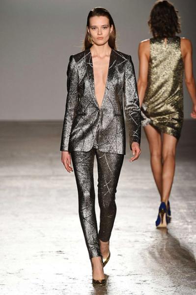 Segni Particolari: Il focus della collezione, è sulle spalle i cui volumi si accentuano, mentre le vite di giacche e cappotti si assottigliano. La silhuette è allungata, con i pantaloni dal taglio asciutto che si stringono alle caviglie con ghette. Eleganti e sofisticati pizzi, svelano disegni Decò e il logo costituito da una maxi “G” in Swarowski. Le spalline e le giacche si impreziosiscono di gioielli, mentre ricami con filo lurex, ricreano movimenti su abiti dai toni dell’oro, bianco e nero.