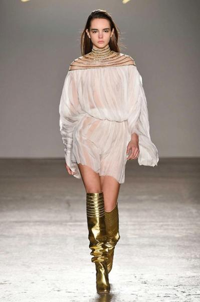 Segni Particolari: Il focus della collezione, è sulle spalle i cui volumi si accentuano, mentre le vite di giacche e cappotti si assottigliano. La silhuette è allungata, con i pantaloni dal taglio asciutto che si stringono alle caviglie con ghette. Eleganti e sofisticati pizzi, svelano disegni Decò e il logo costituito da una maxi “G” in Swarowski. Le spalline e le giacche si impreziosiscono di gioielli, mentre ricami con filo lurex, ricreano movimenti su abiti dai toni dell’oro, bianco e nero.